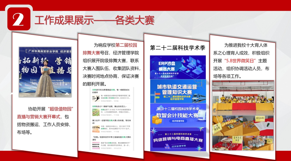 首先由团委书记处、组织部、宣传部、自律部、公关礼仪部和志愿者部进行述职。各部门干部依次上台对其一学年的工作情况进行汇报,总结工作中的收获和不足,并提出今后的改进措施和工作计划。