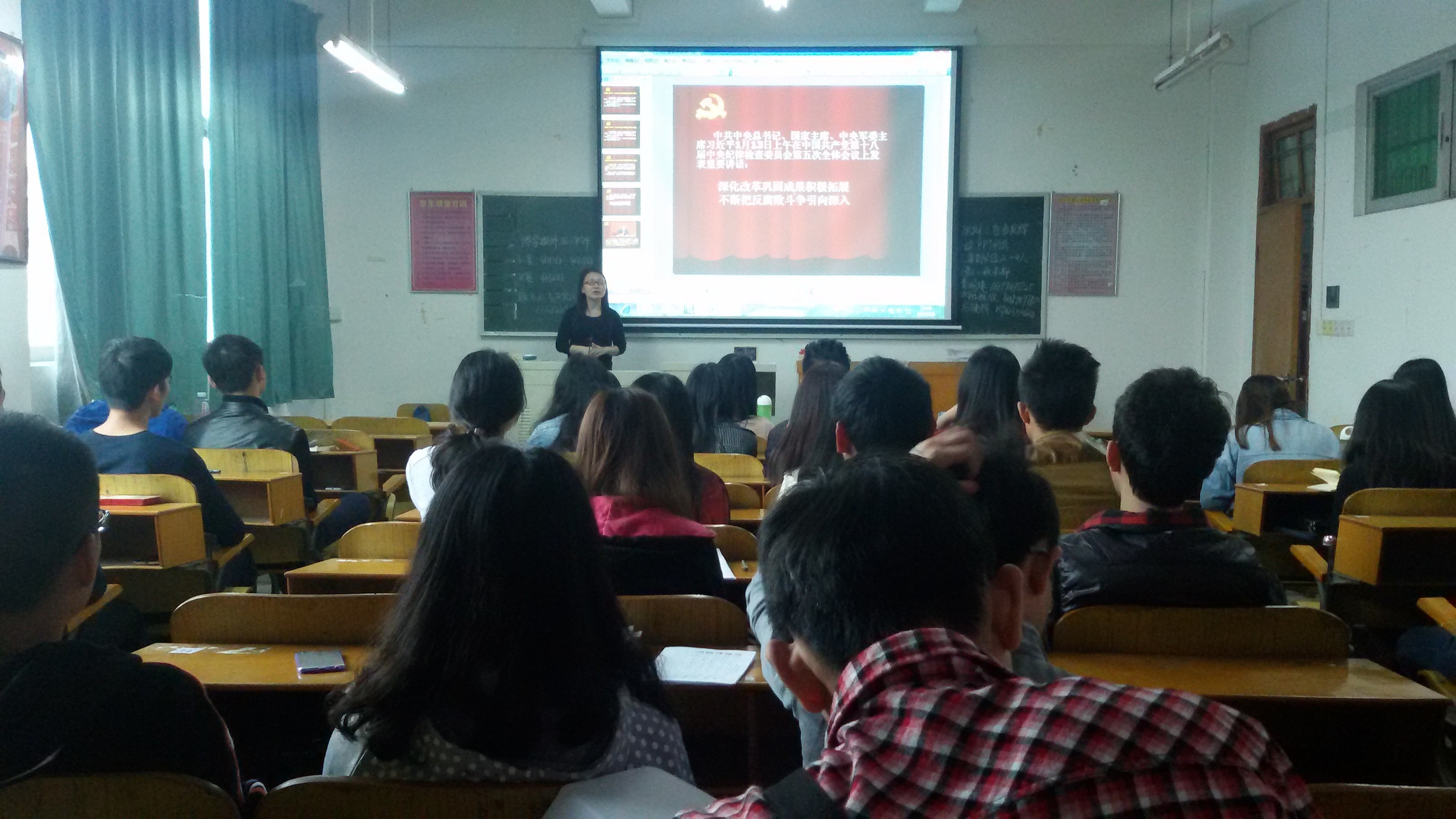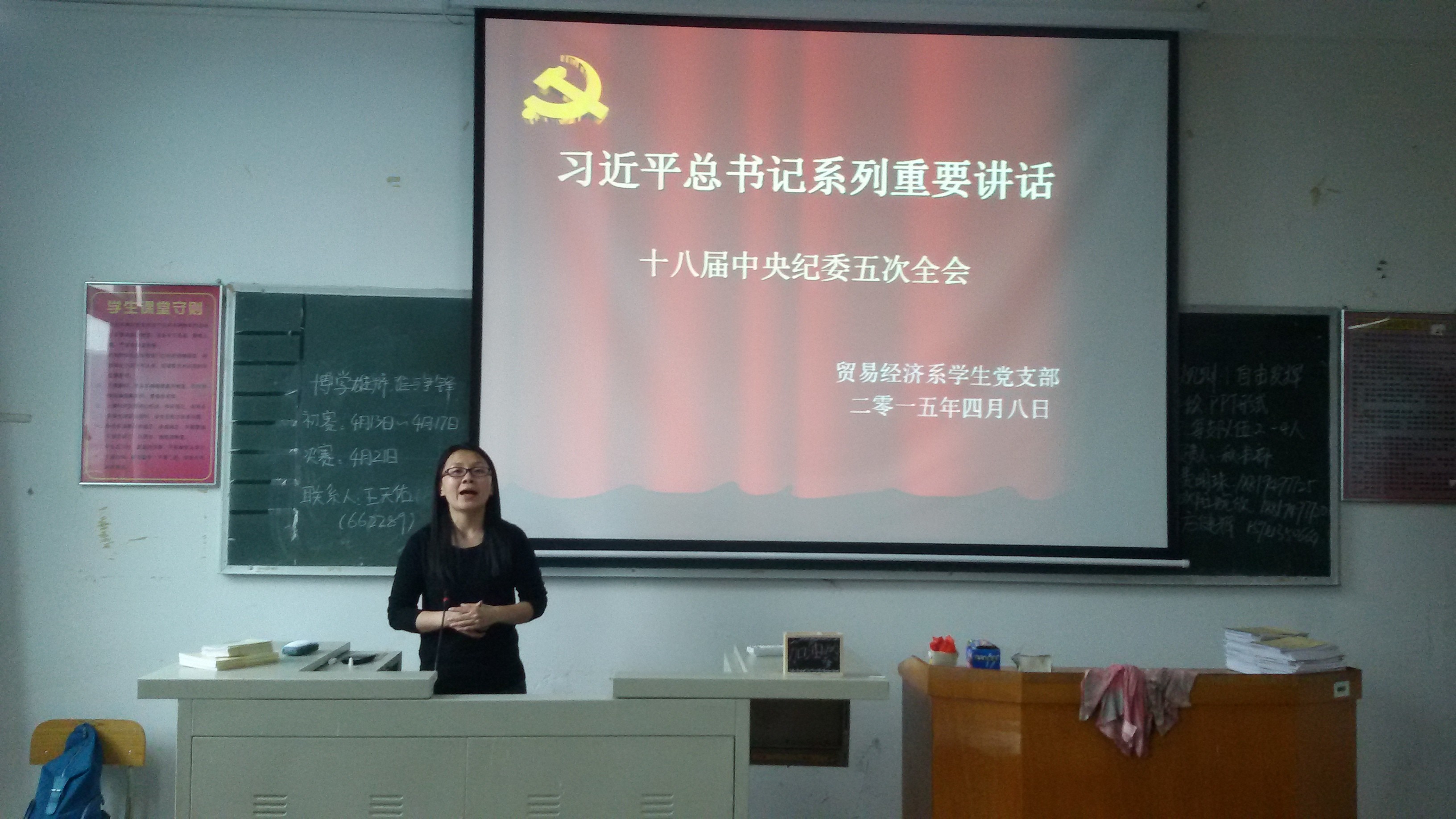 为了更好的让学生党员和入党积极分子积极践行社会主义核心价值观,深入学习习近平总书记系列讲话精神,2015年4月8日,贸易经济系学生党支部组织学生党员和入党积极分子在教学楼302开展学习会,会议由学生党支部书记罗欢同志主持。
