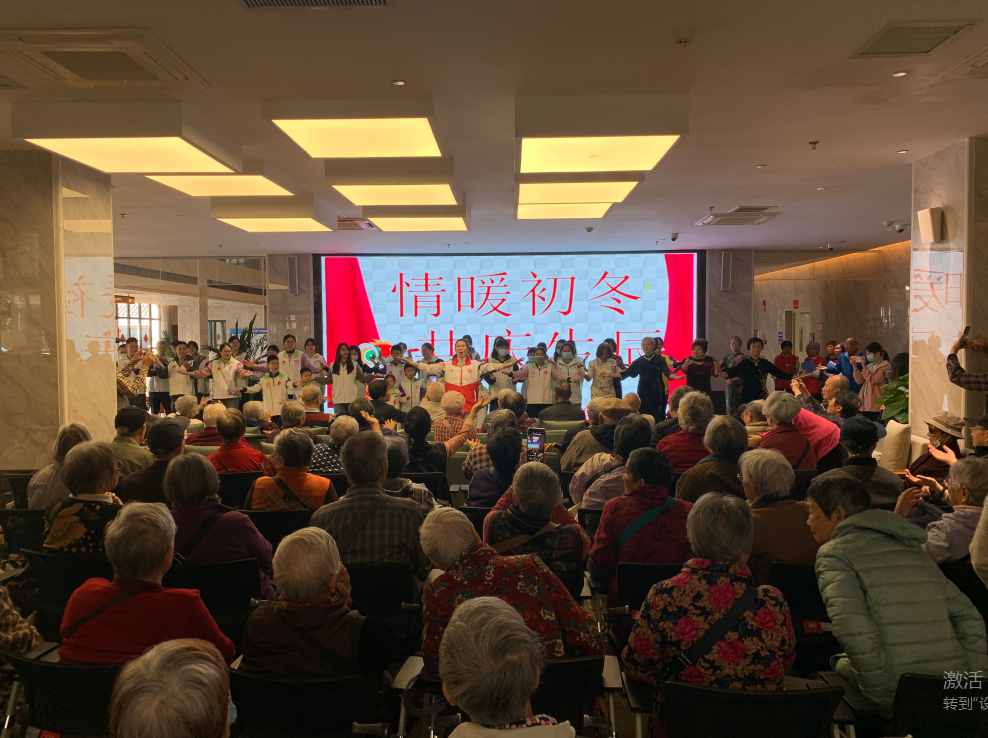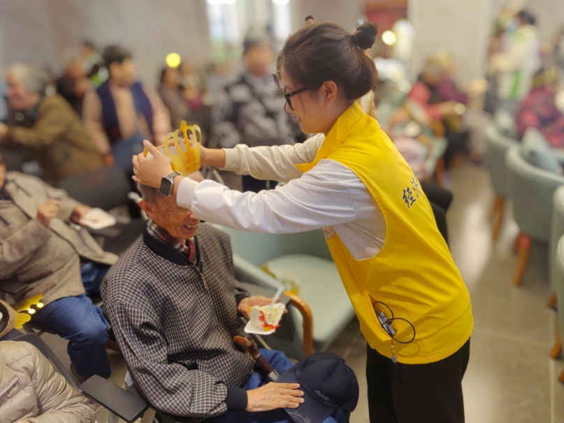 活动伊始,志愿者们两两一组,按照事先的安排奔赴各个园区,带着最诚挚的笑容和关切的问候从各个园区搀扶着老人前往活动地点,并为老人们戴上生日帽。有的老人脸上带着淡淡的微笑,仿佛在回忆往昔的美好;有的老人则好奇地张望着周围,满怀着对这场专属生日会的期待。