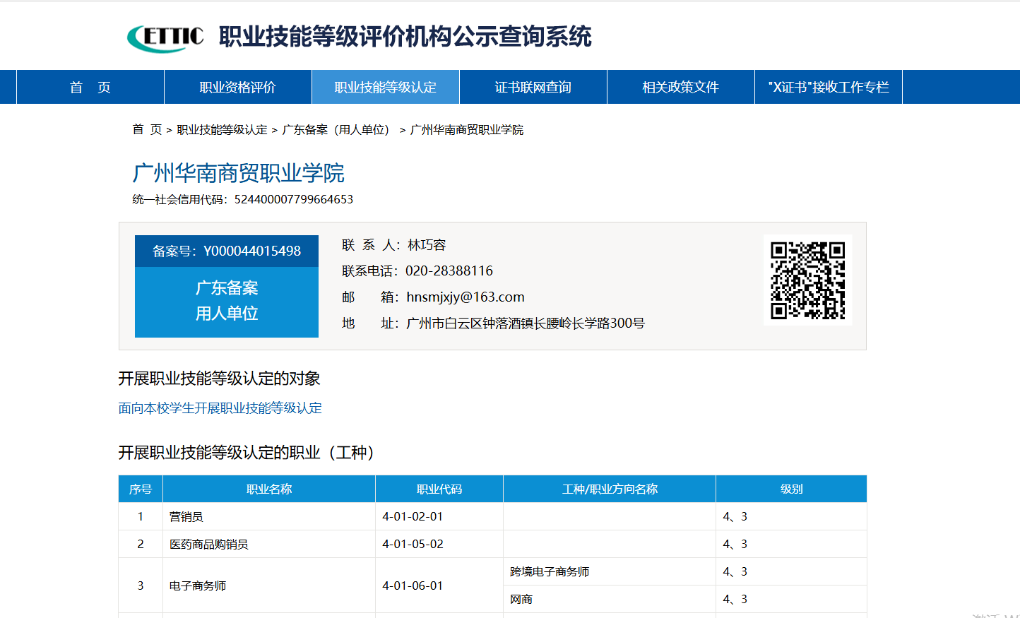 我校已成功备案为广州市人力资源和社会保障局认可的院校职业技能等级认定机构,所颁发的电子商务师证书均可在国家人社部官网(技能人才评价工作网)查询,权威性和社会认可度直接拉满。