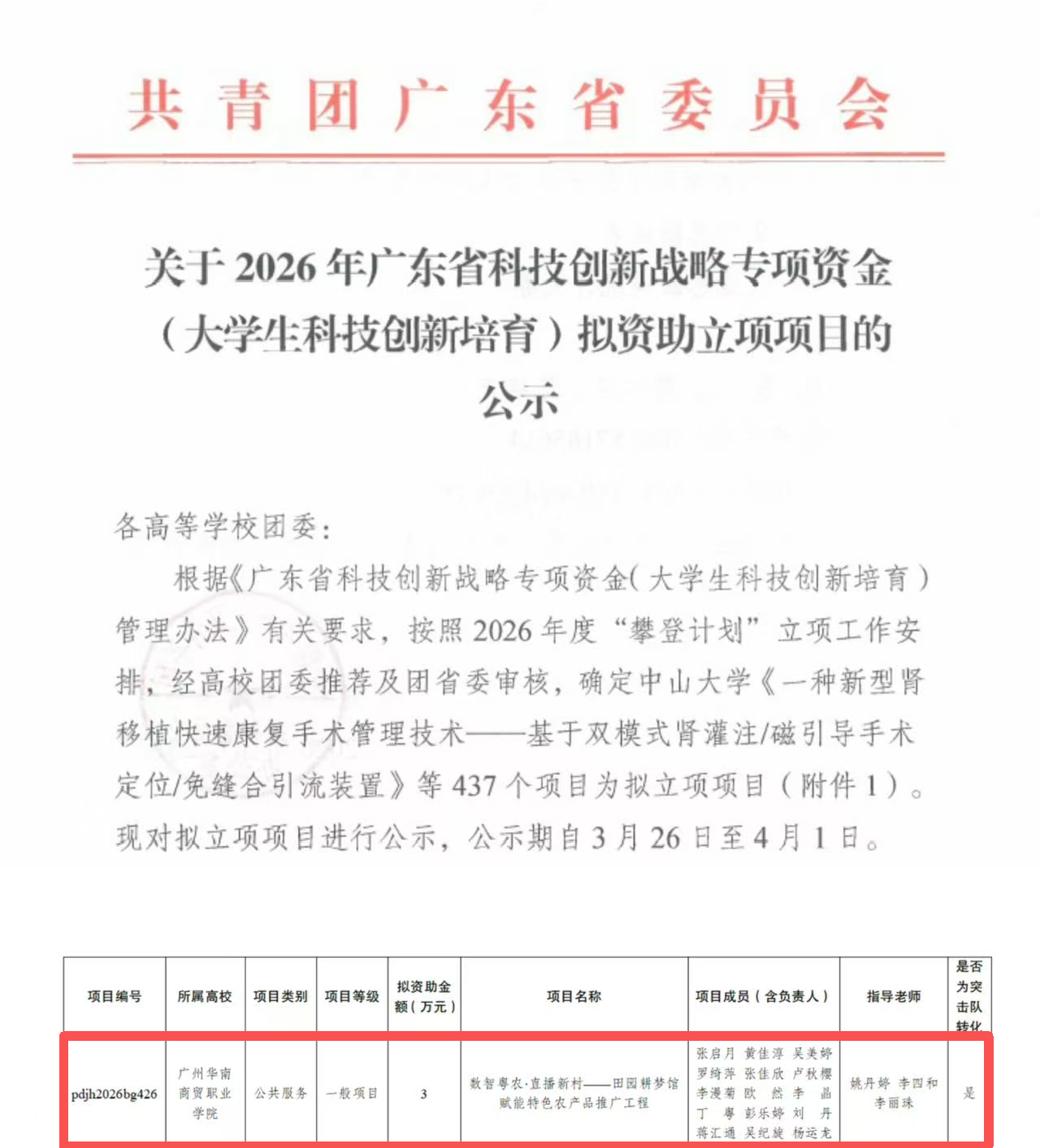 近日,共青团广东省委员会公布了 2026 年广东省科技创新战略专项资金(大学生科技创新培育)拟立项项目名单,经济管理学院申报的《数智粤农・直播兴村——田园耕梦馆赋能特色农产品推广工程》项目成功获批立项!
