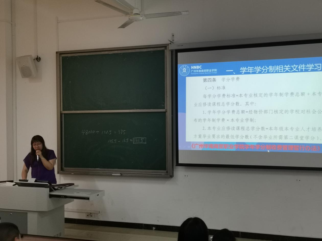 接着,谢桂珊副院长主要传达了2个方面的精神:一是传达学校教学工作例会的相关要求。根据教学科研部反馈,各教研室要对期初教学检查发现的问题及时整改并且落实到位。根据《广州华南商贸职业学院第五届“互联网+”大学生创新创业大赛的工作方案》通知,专任教师和辅导员要积极动员学生参加“互联网+”创新创业大赛。二是重点给全体教职工解读了《广州华南商贸职业学院学年学分制管理暂行办法》、《广州华南商贸职业学院学年学分制选修课建设与选课管理实施办法》、《广州华南商贸职业学院学年学分制收费管理暂行办法》等文件精神。谢桂珊副院长要求班主任和辅导员要通过班会等形式向学生详细解读学年学分制的相关规定。
