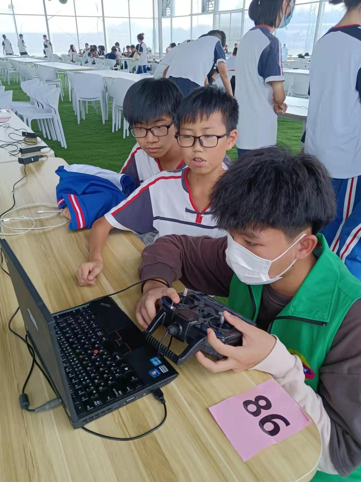 中学生首先体验无人机模拟飞行。这是体验无人机实飞前的模拟操控练习,真实模拟各种复杂环境下的飞行状况,并通过仪表盘实时反馈飞行器参数。在我院电子商务专业的研学助教指导下,中学生使用无人机模拟器,在规定时间内将飞机起飞,并将空中的气球撞破。