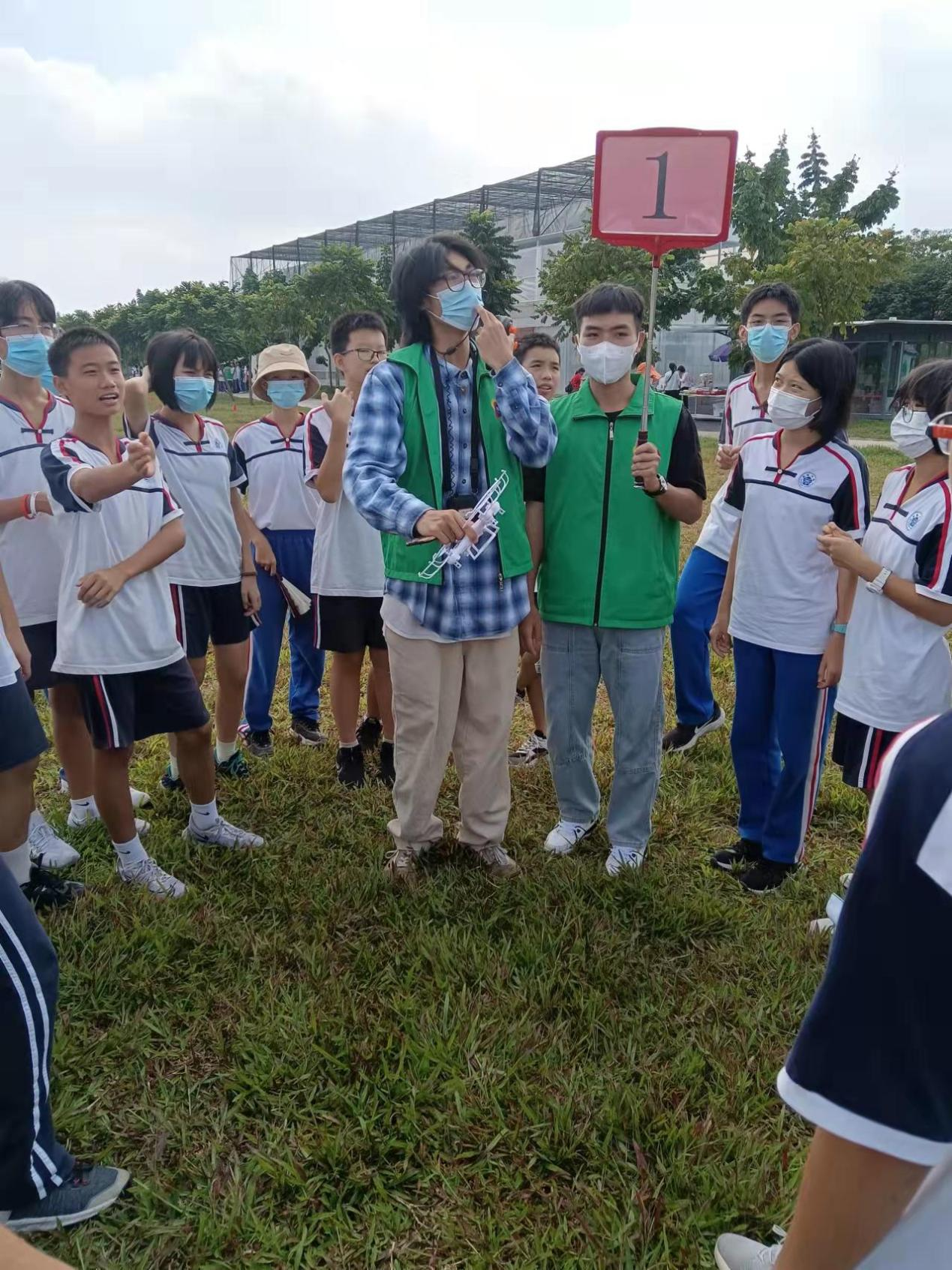 早上8点,我院师生乘坐大巴到达北纬2308森林营地。同学们到达营地后马上来到负责区域,准备好模拟飞行器、无人机、飞越圈等物资,等待玉岩天健实验学校的初二年级学生前来参加研学活动。