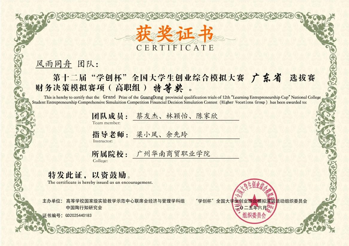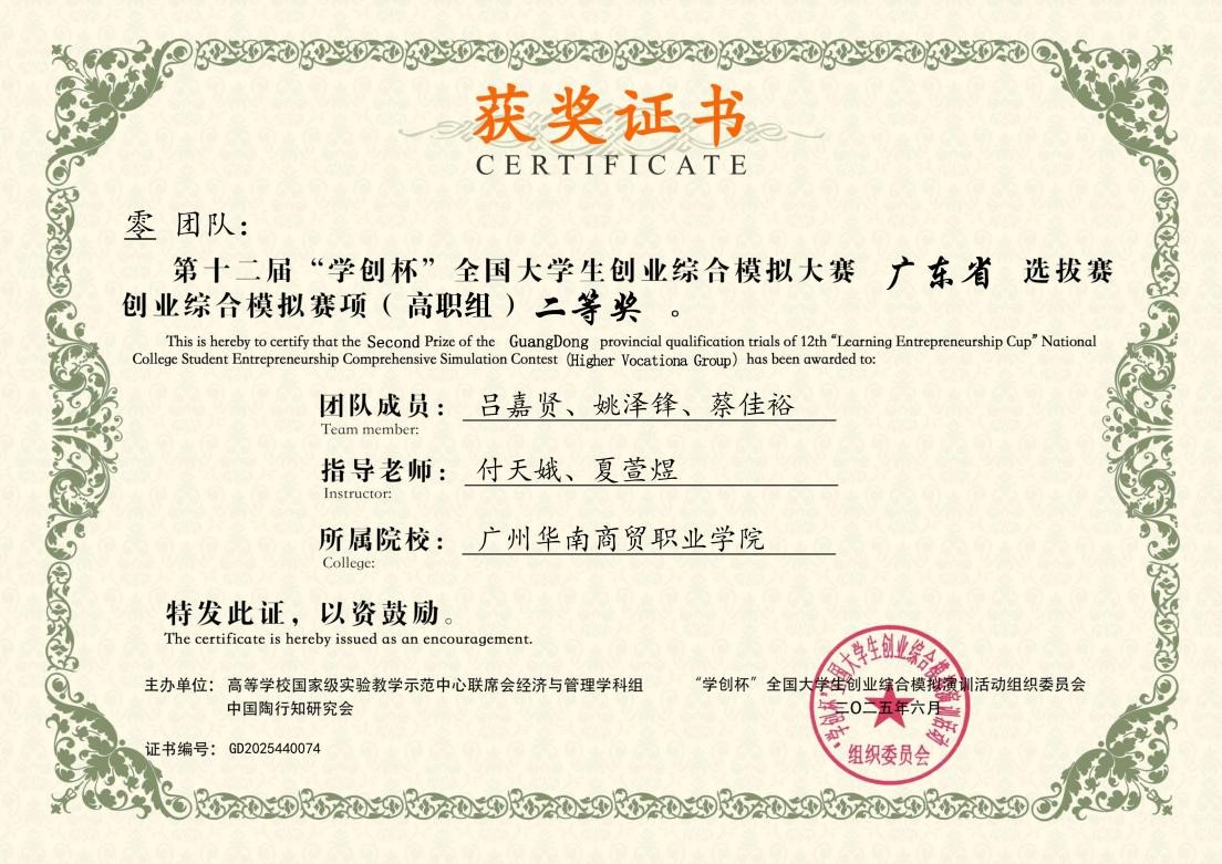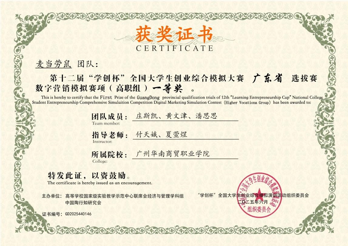 “学创杯”全国大学生创业综合模拟大赛由高等学校国家级实验教学示范中心联席会经济与管理学科组、中国陶行知研究会主办,自2014年起已连续举办11届,是列入中国高等教育学会《全国普通高校大学生竞赛排行榜》赛事之一,是培养创业实践能力的重要平台。本次比赛广东省选拔赛同样高手如云,我校参赛团队赛前苦练内功,赛中精准分析市场、高效运营、紧密配合,在数字营销等多个赛项中表现卓越,斩获特等奖1项、一等奖1项、二等奖3项,4位指导老师获优秀指导教师奖。
