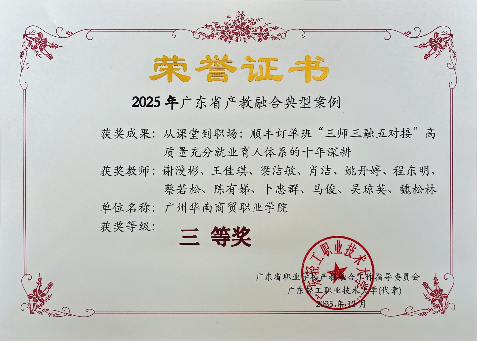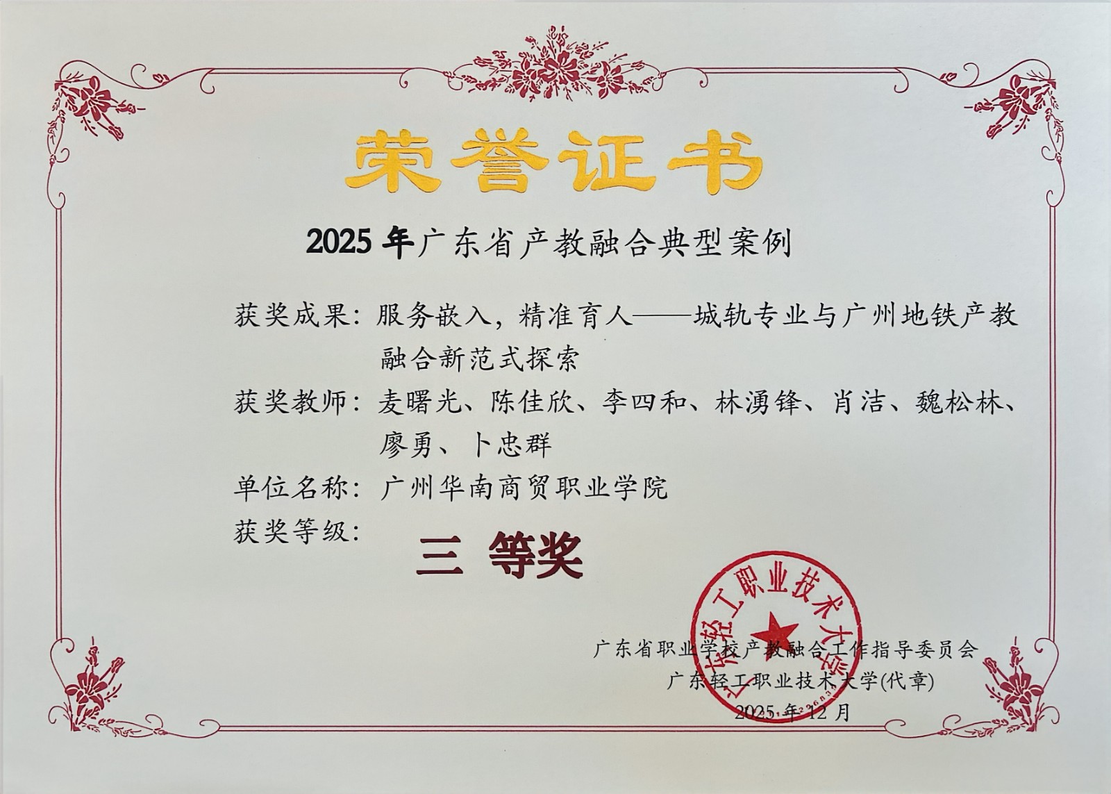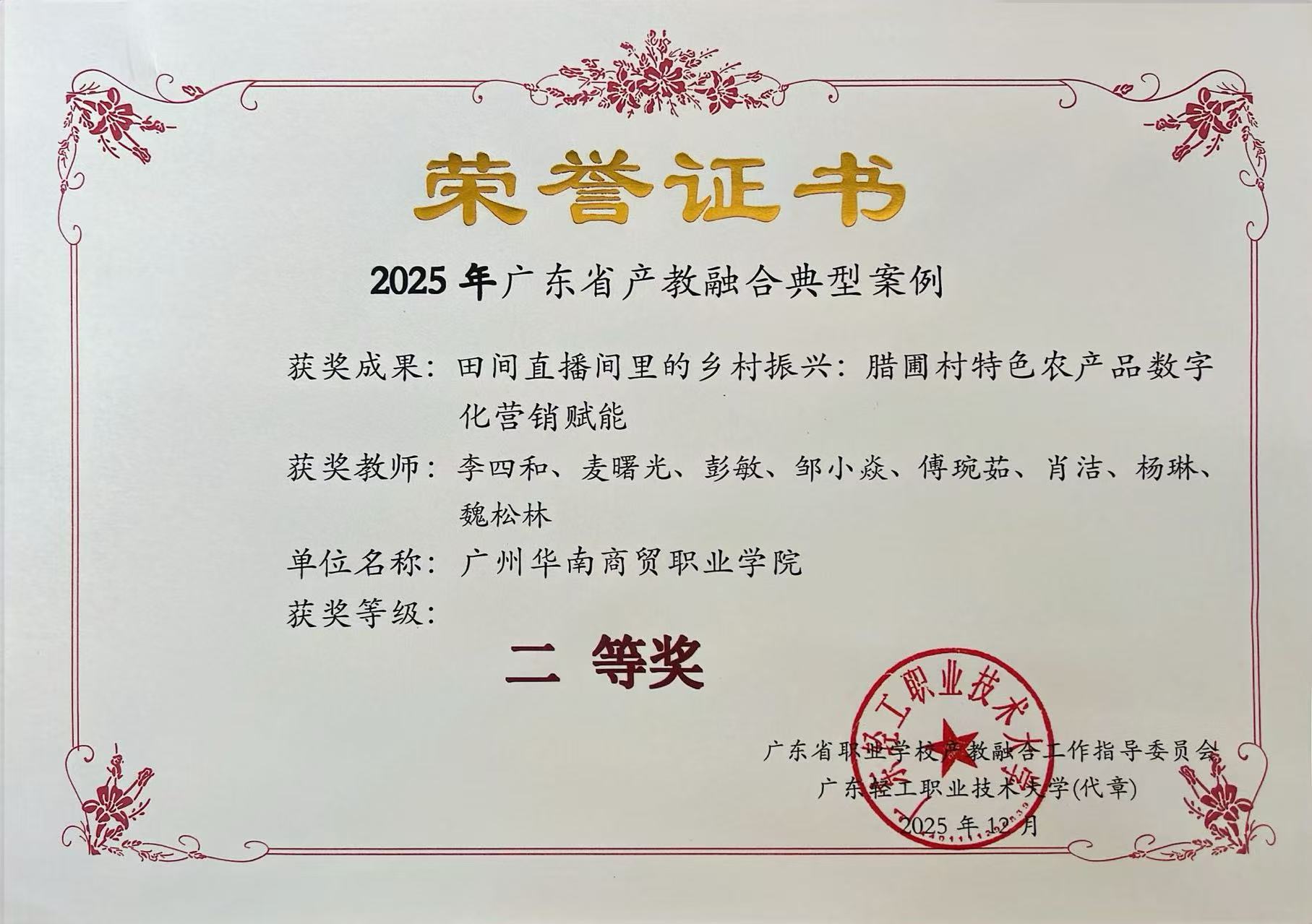 2025年12月,广东省职业学院产教融合工作指导委员会公布2025年广东省产教融合典型案例评选结果。我院申报的三项成果全部入选,其中网络营销与直播电商专业实践成果获二等奖,现代物流管理、城市轨道交通运营管理专业实践成果获三等奖。这是我院在深化产教融合、服务区域发展方面取得的又一重要突破。