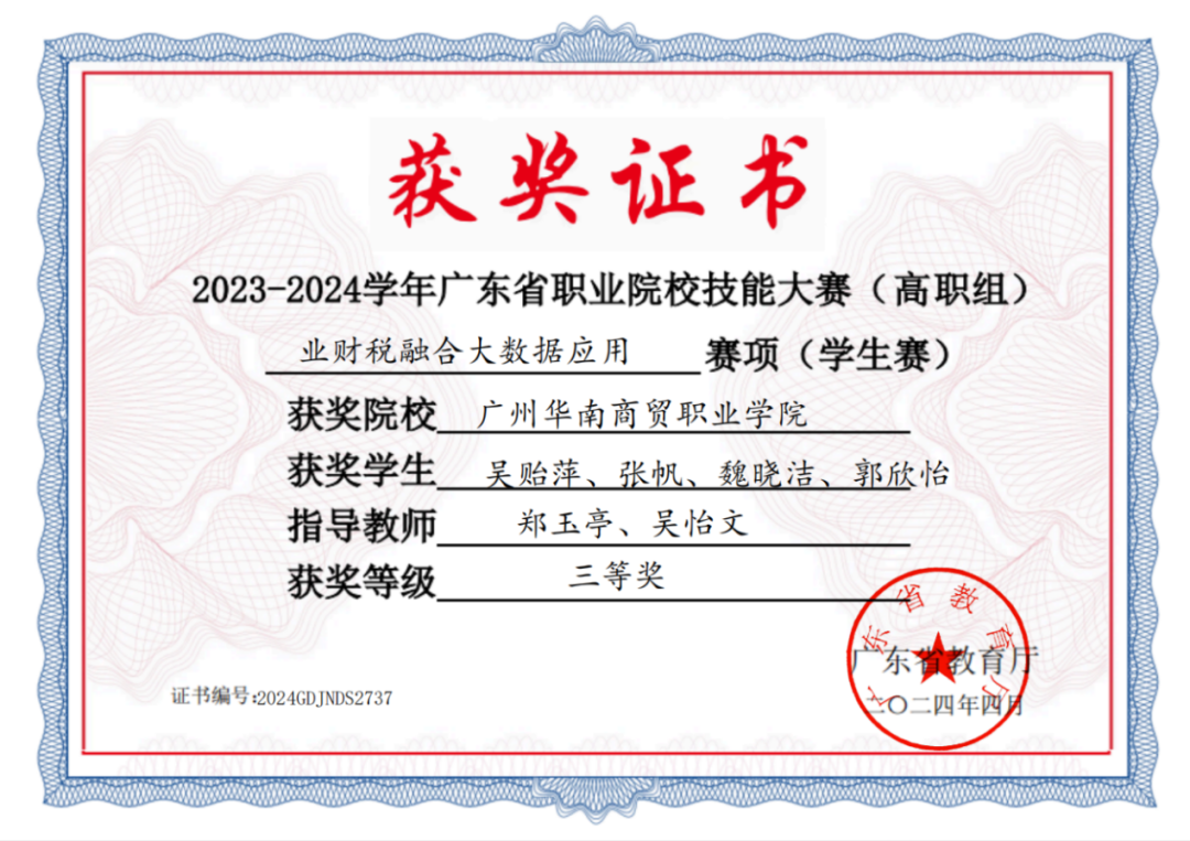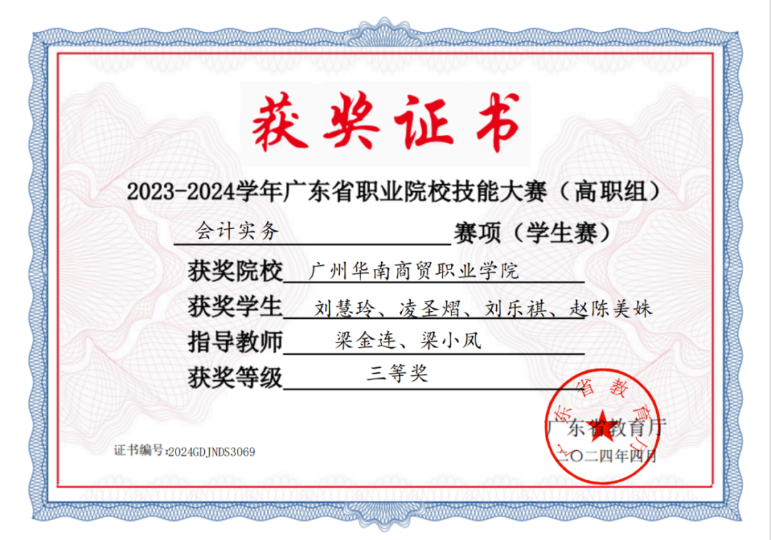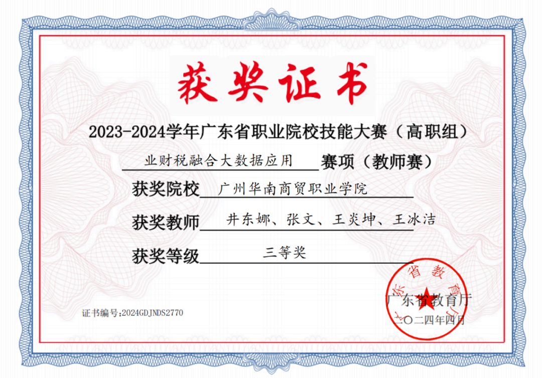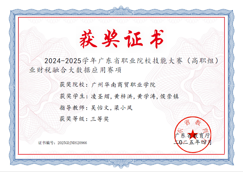 目前,大数据与会计专业拥有专任教师28人,兼职教师3人,其中75%以上的教师团队具备“双师”资质。该专业在各类技能大赛中表现优异,屡获佳绩:2019年广东省职业院校技能大赛(高职组)会计技能竞赛二等奖、2020年广东省职业院校技能大赛(高职组)会计技能竞赛三等奖、2021年广东省职业院校技能大赛学生专业技能竞赛会计技能赛项(高职组)三等奖、2022年广东省职业院校技能大赛学生专业技能竞赛会计技能赛项(高职组)三等奖、2023年广东省职业院校技能大赛(高职组)税务技能竞赛三等奖、2023年广东省职业院校技能大赛(高职组)会计技能竞赛三等奖、2024学年广东省职业院校技能大赛(高职组)会计实务赛项(学生赛)三等奖、2024学年广东省职业院校技能大赛(高职组)业财税融合大数据应用赛项(学生赛)三等奖、2024学年广东省职业院校技能大赛(高职组)业财税融合大数据应用赛项(教师赛)三等奖、2025学年广东省职业院校技能大赛(高职组)会计实务赛项(学生赛)三等奖、2025学年广东省职业院校技能大赛(高职组)业财税融合大数据应用赛项(学生赛)三等奖等。