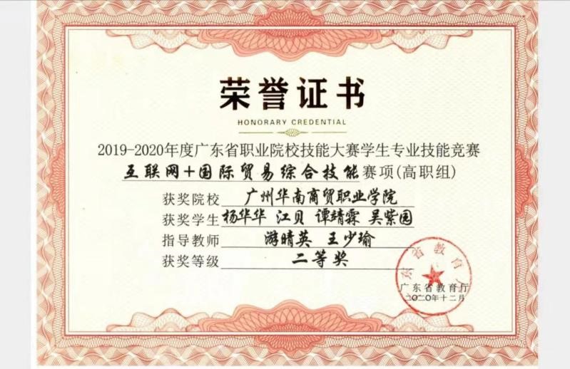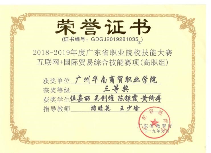 近年来,国际经济与贸易专业学生积极参加广东省教育厅举办的“互联网+”国际贸易技能大赛荣获二等奖一项,三等奖两项;学生张瑞欣参加步惊云举办的跨境电商技能大赛喜获特等奖。