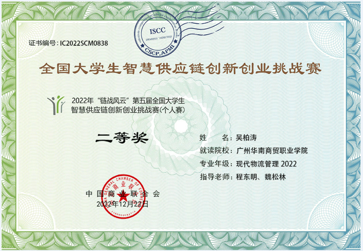 物流师(中级);计算机(办公软件)等级证书;英语应用能力等级证书;供应链管理师、国际货运代理人证书和SYB创业培训证书等。