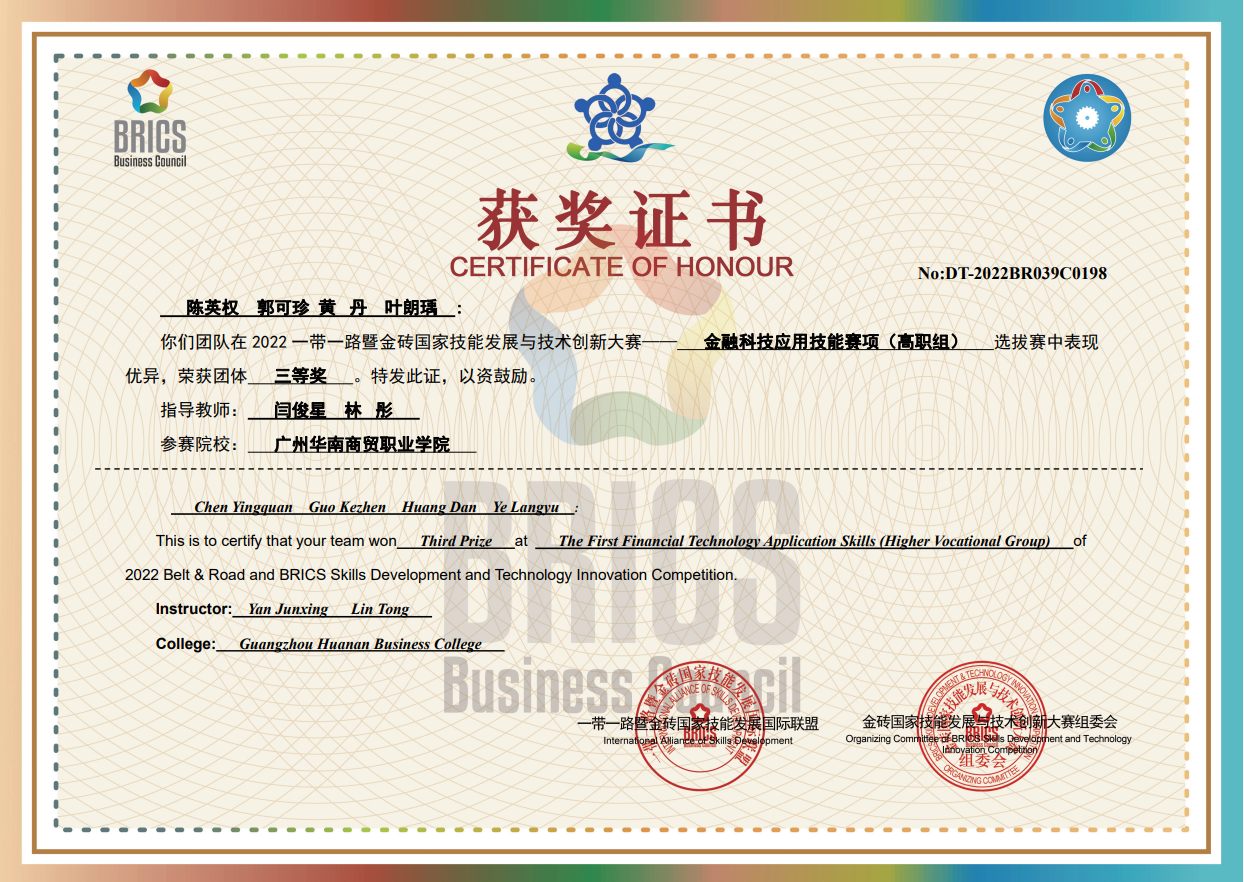 注重学生职业技能素养培养,积极组织学生参加各种专业竞赛,如广东省教育厅举办的“金融科技应用技能大赛”、“银行业务综合技能大赛”、“税务技能大赛”等赛项。教师指导学生参加“2022 一带一路暨金砖国家技能发展与技术创新大赛”金融科技应用技能赛项荣获中国区域赛三等奖1项、优秀奖1项。教师指导学生参加共青团中央主办的“东方财富杯”全国大学生金融精英挑战赛荣获全国二等奖1项。教师指导学生参加“黄炎培杯”全国大学生财富管理(投资理财)知识技能大赛荣获个人赛全国一等奖1项、三等奖3项以及团队赛全国三等奖1项的好成绩。