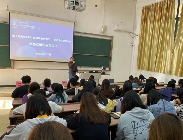 为了进一步落实深化校企合作,加强产学研深度融合,对接社会需求,围绕电子商务专业群、旅游管理专业群、中医养生保健专业群与广州博疆一生物科技有限公司签订了共建430特色课堂暨订单班协议。2022年3月2日,我校邀请公司创始人、广东十大科学传播达人吴盟博士出席倍特订单班启动仪式。校企合作办吴琼英同志、数智经济贸易学院刘万华院长、谢桂珊副院长、院长助理曾燕锋、新商务管理学院副院长王成成、钟法声、新商务外语学院、健康学院副院长蔡天奎副院长出席了启动仪式。20级市场营销专业、20级电子商务专业、20级大数据与会计专业以及健康学院、新商务管理学院相关专业学生共190人参加了本次活动。启动仪式由数智经济贸易学院院长刘万华主持。
